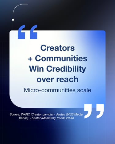 Across WARC’s 2026 toolkit framing and dentsu’s 2026 media outlook, influence is decentralizing: credibility is built through real communities, participation, and creators who feel native to culture—not through volume alone.